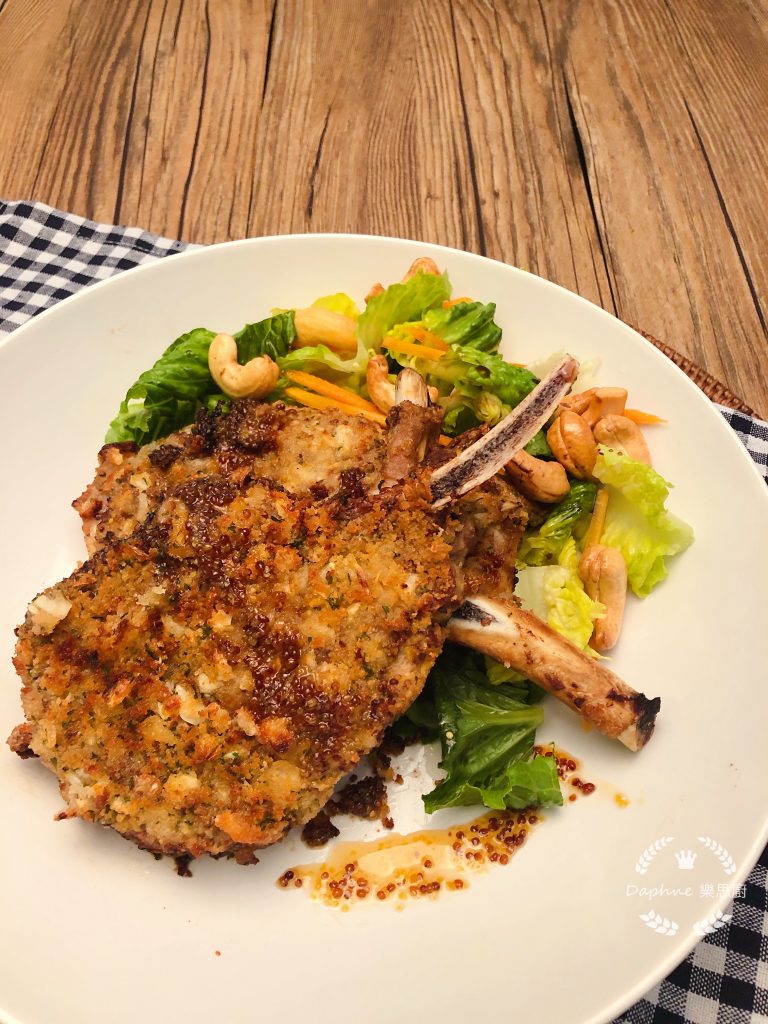 2. 豬鞍以中火煎至2面金黃,特還暖時在兩邊塗上蜜糖mustard,再沾上寶雲酥料
