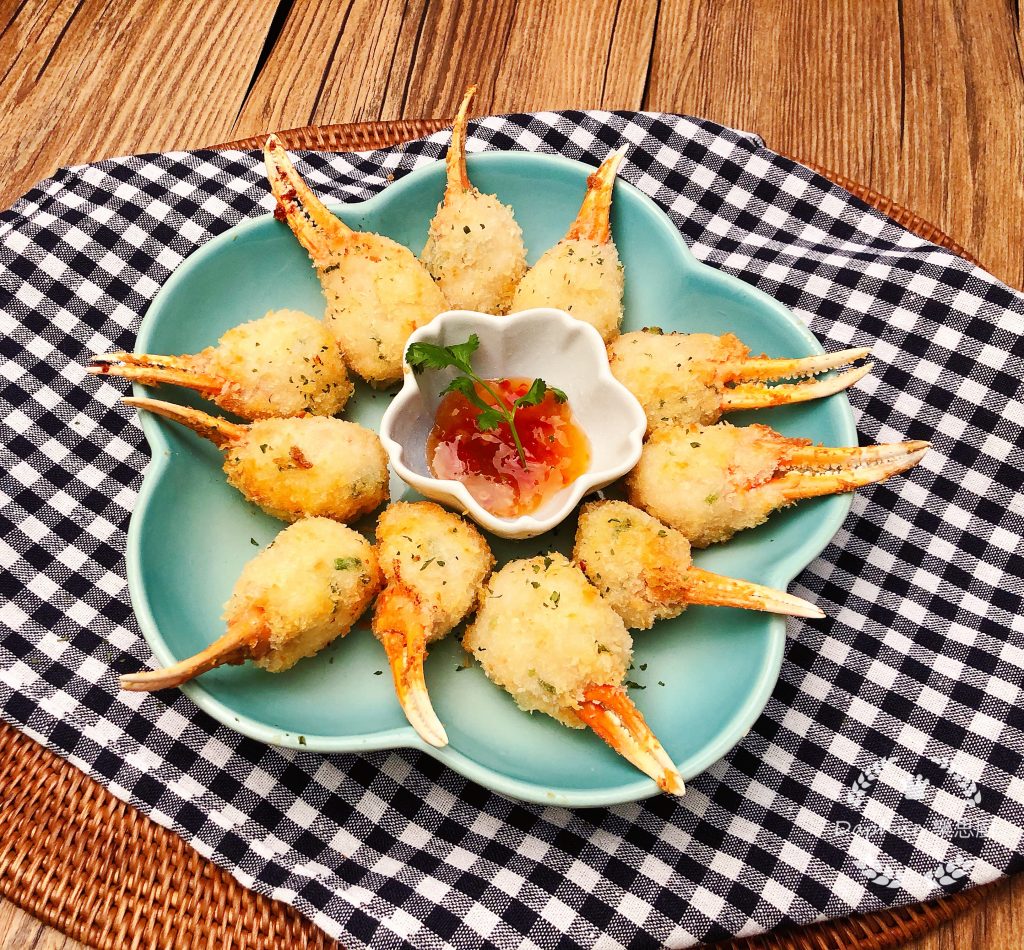 材料:蟹鉗18隻、海中蝦斤半、蔥花適量、麵包糠適量、食油適量