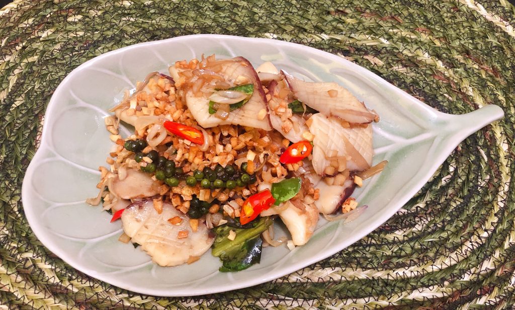 一隻大墨魚真的可以食幾日,日日都白灼都好悶,所以要搞搞新意思。香港有馳名的避風塘炒蟹,既香口,又能帶出海鮮的鮮味。今日搞搞新意思,用避風塘香口的炒法加上泰菜經常用的香草,看看效果如何。