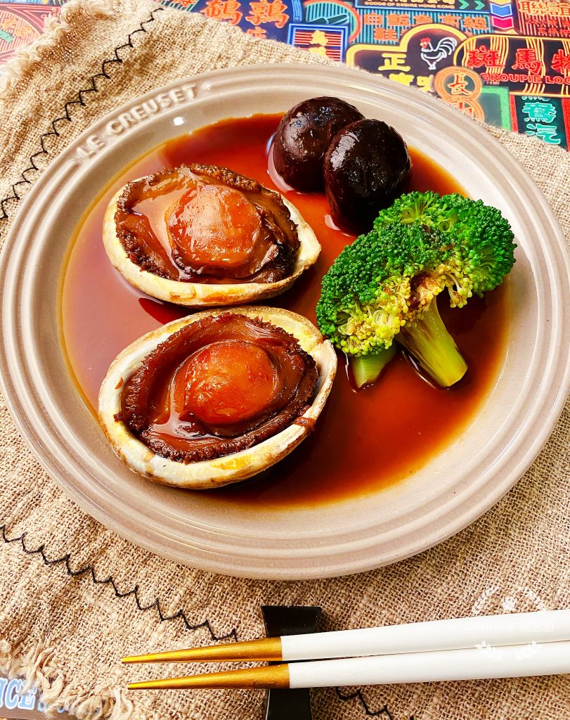 9. 在碟中放上兩隻鮑魚殼,置入兩隻鮑魚,在旁邊加入兩隻冬菇及西蘭花,放上煮好了的汁即可