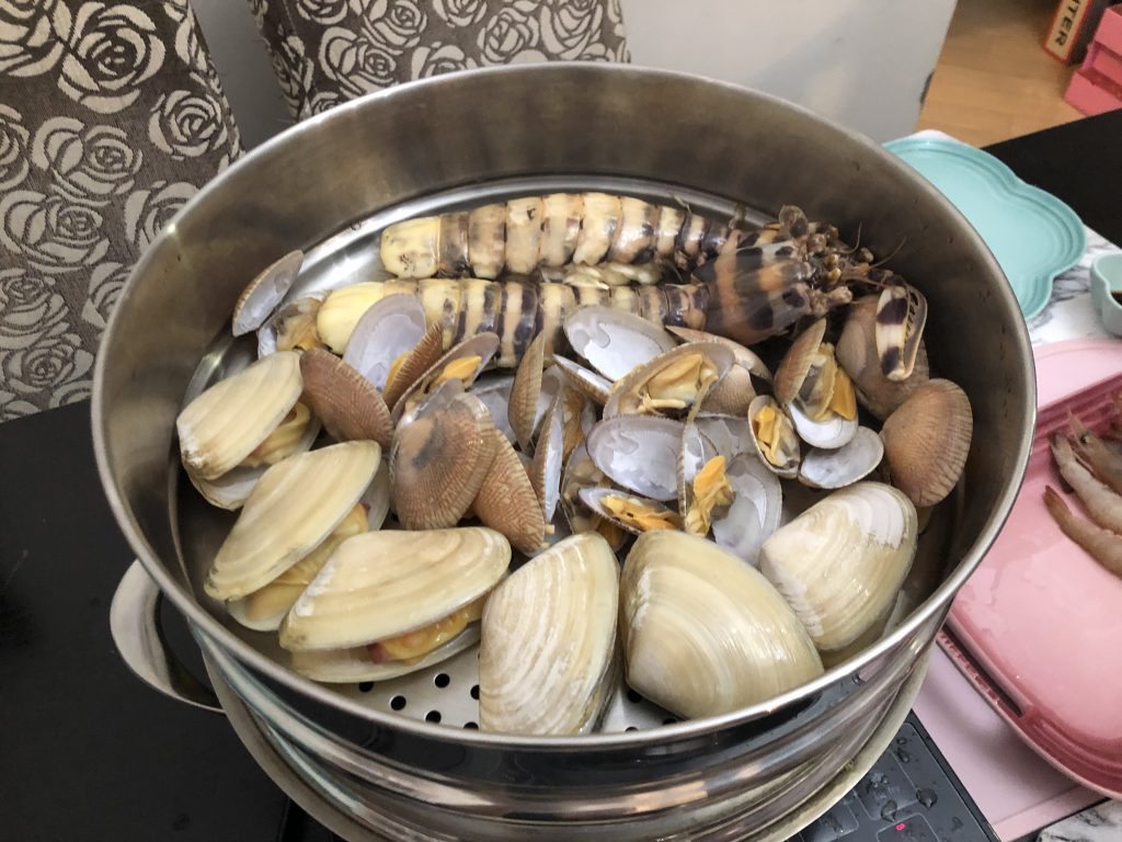 - 蒸架上層放刀貝、花甲及斑馬瀨尿蝦