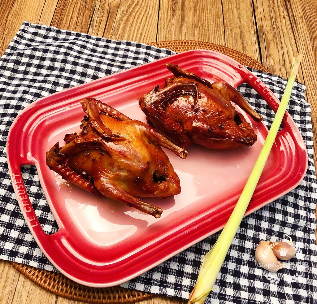 今天很晚才吃飯,所以很晚才寫食譜。昨天在街市買來兩隻皮薄肉厚的乳鴿,昨晚先用鹽醃一晚,今天放工很晚,家中沒有太多醃料,就用雪櫃常常有的香茅、蒜頭及泰式醬料,做一個充滿泰味的香茅乳鴿啦!