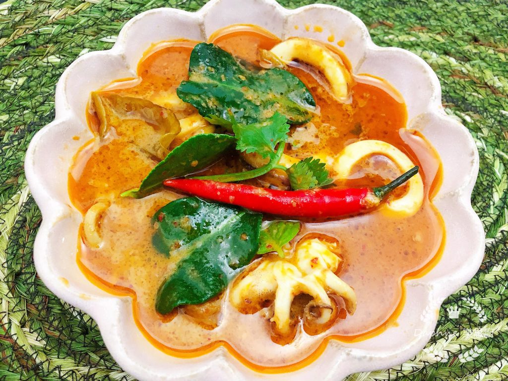 以紅咖哩煮魷魚,這個組合相當不錯,紅咖哩有魷魚的鮮味,魷魚則變得惹味。另外,很多朋友也有另一疑問,就是紅咖哩面為甚麼那麼多油,會很肥嗎?其實,煮咖哩時我只下了1茶匙的油,而大家看到的,其實是椰汁經長時間醬火煮後所出的椰油啊,並不是肉類所出的油啊,無論是否加肉,只要細火煮的時間夠長,椰油還是會出來的,所做的咖哩就漂亮多了。